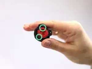 Протолкните диск до конца шнура и повторите предыдущие шаги: вставьте металлическую петлю со шнуром в другое отверстие диска (зелёный круг).