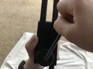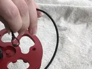 Поверните кулачок так, чтобы штырь оказался виден внутри, по направлению к тросовому стержню. Прикрепите чёрный силовой трос к штырю. Убедитесь, что он проходит между штырями при прохождении через кулачок, как показано ниже.