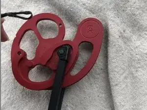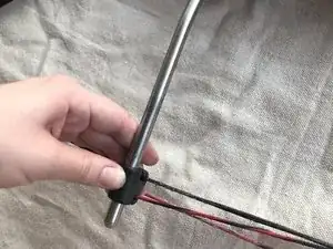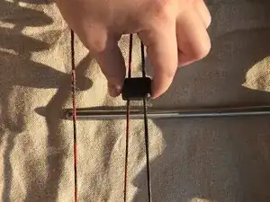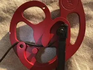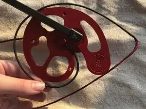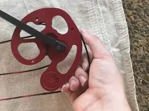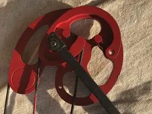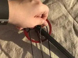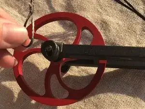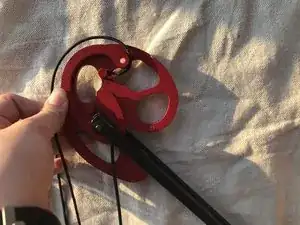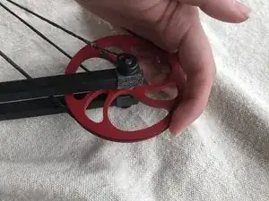 Снимите чёрную и красную тетиву с штырей кулачка. Затем отцепите тетиву от опорного колеса.