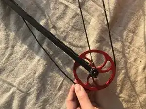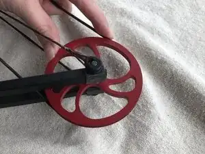 Снова зацепите тетиву за кулачок, пропустив её между луковыми плечами вверх, вокруг опорного колеса, под тросовым стержнем и над плечами.