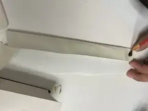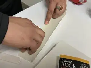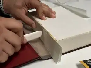 Используйте разделительную лопатку, чтобы прижать и разгладить ремонтную ленту по корешку, чтобы клей распределился равномерно.