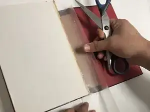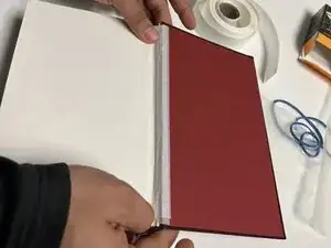 Отрежьте кусок ремонтной ленты для книг длиной немного больше длины корешка (примерно на 1,2 см) с помощью ножниц.