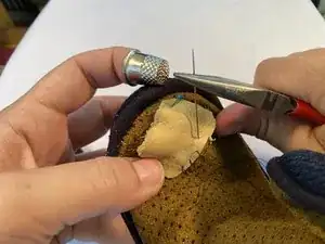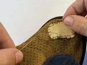 После того как вы протянули нитку через патч снизу, примерно на 0,6 см от края, используйте наперсток, чтобы протолкнуть иглу через kote, сразу за пределами патча.