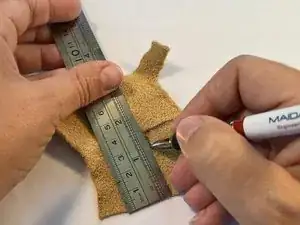 Используйте линейку и ручку, чтобы провести направляющие линии для этих измерений прямо на обратной стороне кожаного патча.