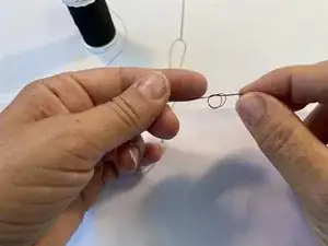 Свяжите оба конца нитки в квадратный узел, создав петлю, продев концы через петлю и затянув узел.
