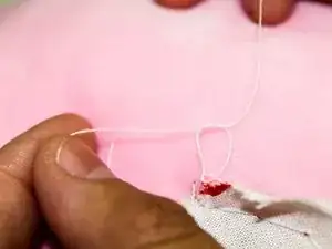 Начав с внутренней стороны игрушки, введите иглу в ткань и протяните её наружу.