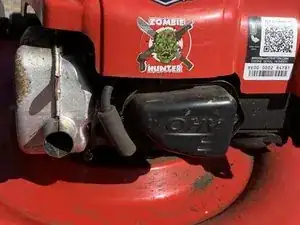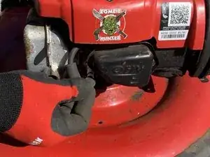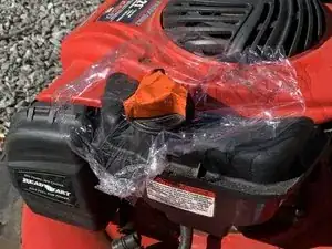 Верните газонокосилку в вертикальное положение и снимите пищевую плёнку с крышки бензобака.