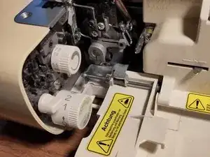 После длительных аккуратных нажатий и тяг выяснилось, что тяги, приводящие иглу в верхней части машины, заблокировались. С помощью некоторой силы их удалось разблокировать, что исправило машину.