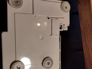 Нижняя панель легко снимается после откручивания четырёх винтов в ножках. Она открывает нижнюю часть трансмиссии. Лучше заново прикрутить ножки после снятия панели, чтобы машина стояла устойчиво при дальнейшей разборке.