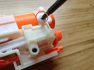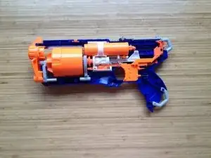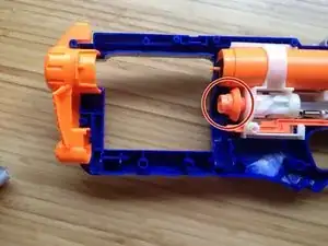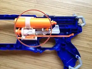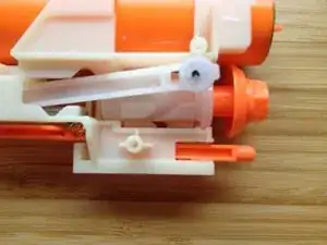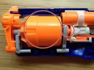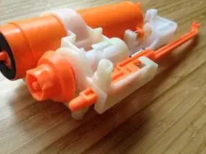 Хорошая идея — протестировать механизм перезарядки ствола, двигая поршень перезарядки туда и обратно. Если оранжевый элемент, прикреплённый к стволу для дротиков, вращается — это хороший знак.