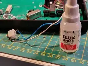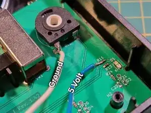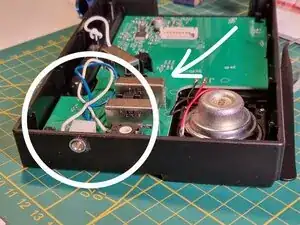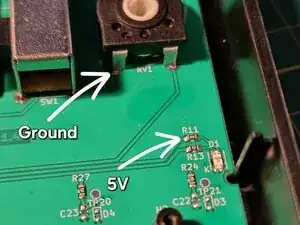 Припаяйте два провода к точкам, показанным ранее. Синий провод будет передавать 5-вольтовый импульс при каждом тике метронома.