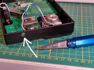 При выборе места для отверстия помните, что внутри, на другой половине корпуса, есть опоры, фиксирующие плату (третья фотография). Сверлите в относительно свободном месте.