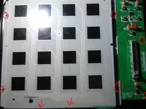 Потяните резиновый пад на себя, чтобы увидеть элементы емкости. Удалите все винты, которые удерживают этот пад и печатную плату (не все показаны на фото).