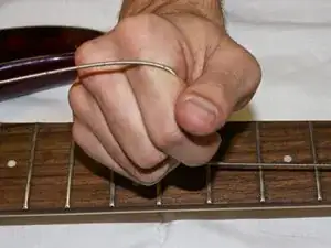 Одной рукой удерживайте натяжение струны, захватив её и повернув руку в сторону грифа.