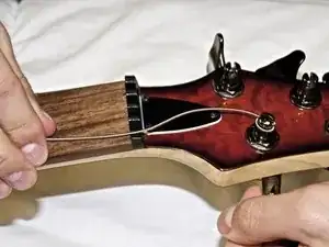 Согните струну в сторону и уложите её в канал струнотримача.