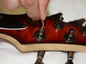Возьмите конец струны и вставьте его в отверстие посередине струнотримача.