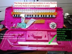 Идея заключается в том, чтобы подложить прокладку между полосой с кнопками клавиш и розовыми пластмассовыми опорами в нижней части.