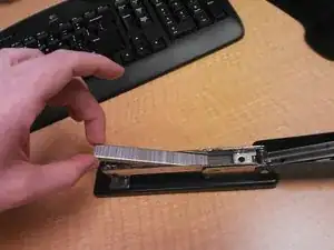 Возьмите за основание степлер и потяните за молоток, пока степлер не откроется, открывая доступ к каретке, толкателю и пружине.