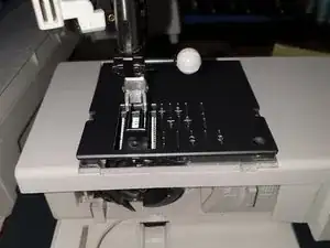 Если вы ещё этого не сделали, снимите иглу, лапку и шпульный корпус со шпульной ниткой. Снимите швейный столик.