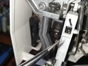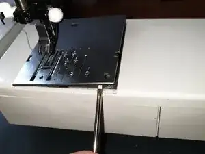 Чтобы увидеть винт, поднимите рукоятку швейной машины. Винт находится примерно посередине задней половины зазора между рычагом швейной машины и крышкой слева.