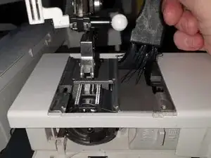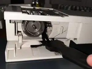 Сзади проходит кабель подсветки швейной машины; аккуратно, чтобы не оторвать его случайно.