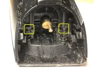 Удалите черную кнопку лезвия и две пружины длиной 10.0 мм, которые находятся между половинами корпуса.
