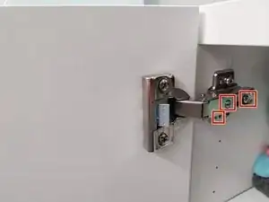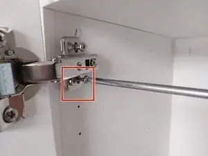 Как и в случае с петлями IKEA, где винты уже вставлены, заверните верхний винт петли на 2–3 оборота. Вставьте винт в отверстие, но не затягивайте его до конца. Главное — чтобы конец винта выступал из металла, так проще будет попасть им в соответствующее отверстие.