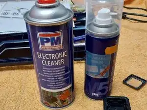 Поэтому второй вариант ремонта (так как у меня нет подходящей запасной кнопки) — обильно нанести очиститель контактов "ELECTRONIC CLEANER", одновременно сдвигая кнопку из стороны в сторону, чтобы попытаться очистить внутренний контакт.