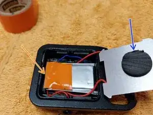 ОСТОРОЖНО С АККУМУЛЯТОРОМ: при сборке он сильно нагрелся за несколько секунд, потому что один из его контактов закоротил на алюминиевую пластину светодиода, поэтому для защиты контактов я решил наклеить изоляционную ленту (оранжевую), закрыв оба контакта.