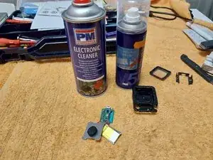 Затем применялся баллон с воздухом (справа на фото баллон для чистки клавиатур), с помощью которого высушили внутренности кнопки и печатную плату.