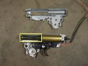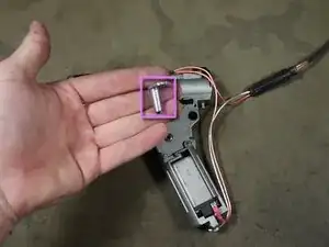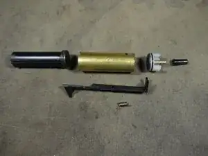 Если вы не произвели холостой выстрел в полуавтоматическом режиме перед разборкой или поршень не сбросился должным образом, вы можете использовать инструмент с зацепкой или плоскогубцы с узким носиком, чтобы освободить показанный предохранитель обратного хода.