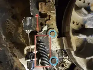 Удалите возвратную пружину, используя плоскогубцы, отвертку или другое устройство. Я снял пружину за конец переднего кронштейна (подальше от ручки газонокосилки). Поднимите вверх и отдалите от кронштейна, и пружина должна выйти.
