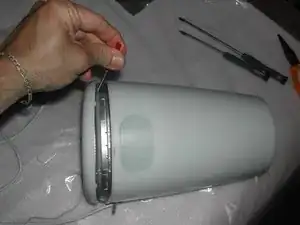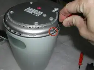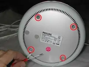 С помощью маленькой плоской отвертки оторвите четыре резиновые ножки, скрывающие винты нижней панели лампы.