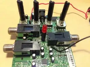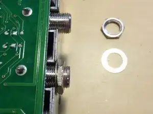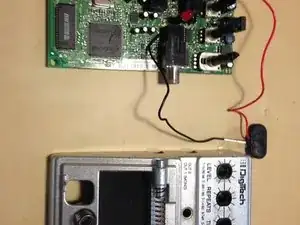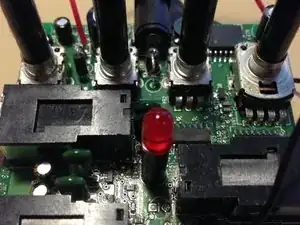 Красный провод припаян слева от порта адаптера постоянного тока, а чёрный провод припаян прямо под единичным 1/4-дюймовым линейным входом.