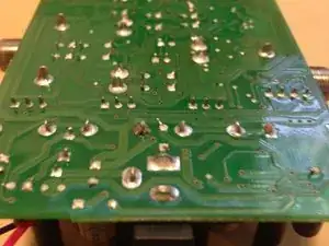 Порт адаптера постоянного тока припаян в трёх крупных точках на обратной стороне платы.