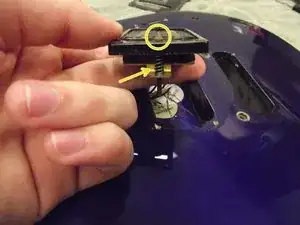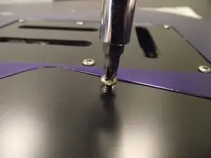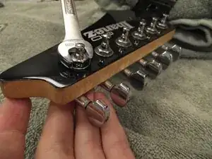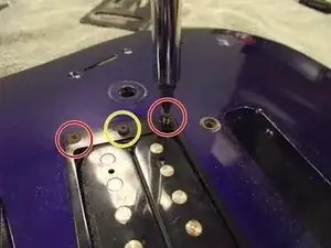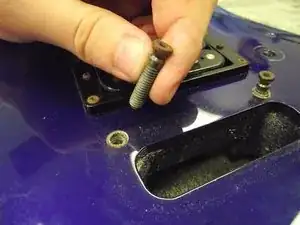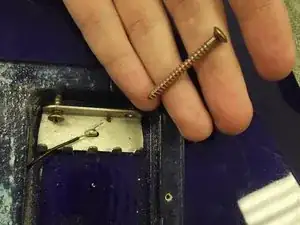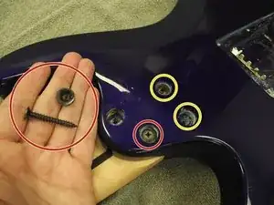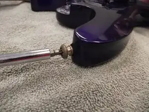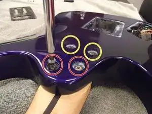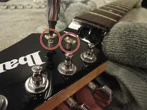 Переверните гитару вверх дном и найдите винты в верхней части корпуса рядом с грифом. Используйте крестовую отвёртку Phillips 2, чтобы выкрутить винты. Будет снят как винт, так и распорная втулка. Обратите внимание на разницу в размерах винтов.