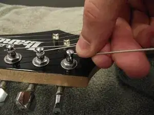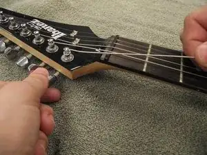 Возьмите струну и полностью вытяните её из корпуса гитары. Возможно, потребуется распрямить ранее намотанные концы, если они не проходят.