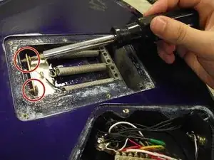 С помощью крестовой отвёртки Phillips 2 ослабьте два анкеровочных винта длиной 1 5/8", чтобы снять часть натяжения со струнных пружин.