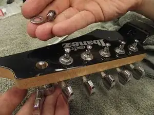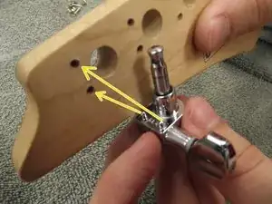 Вытяните колки из грифа. Для последующей сборки обратите внимание, как два штифта на каждом колке совпадают с отверстиями в нижней части головки грифа.