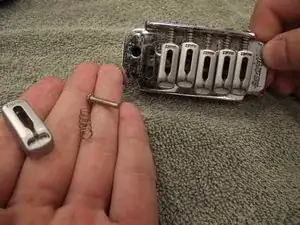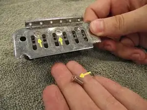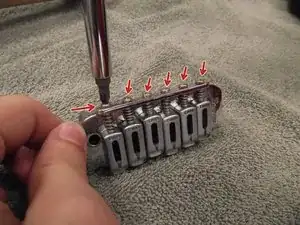 С помощью крестовой отвёртки Phillips #2 выкрутите шесть интонационных винтов 11/16". Пружины и седла моста выйдут вместе с винтом.