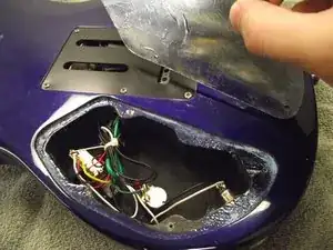 Найдите заднюю крышку отсека проводки на задней стороне гитары. Это крышка без прорезей.