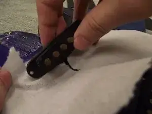 Положите бумажное полотенце под каждый звукосниматель, чтобы собирать ржавчину и не допустить её попадания внутрь корпуса гитары.