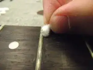 Удаляйте загрязнения от пота и частиц кожи с ладов ватной палочкой. Для удаления застарелых локальных загрязнений можно аккуратно использовать кромку медиатора.