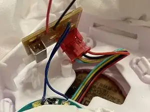 Поднимите блок управления питанием и отсоедините красную вилку от разъёма. Чтобы освободить вилку, потребуется поддеть небольшой фиксирующий язычок.