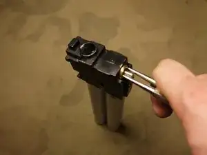 Теперь, держите магазин направленным вниз, возьмите крупный пробойник или подобный инструмент и начинайте выбивать сердечник магазина из корпуса с помощью молотка.