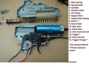 Перед разборкой Вашего электропневматического оружия (AEG) настоятельно рекомендуется снять натяжение пружины, чтобы облегчить разборку редуктора.