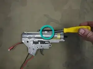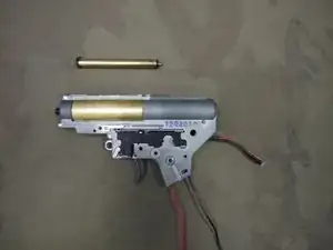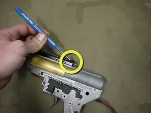 Далее снимите пружину и направляющую пружины, подняв направляющую вверх и вынув её из редуктора. Затем выньте цилиндр и связанные детали, чтобы получить доступ к шестерням.