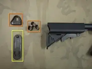 Сперва снимите резиновую накладку приклада, зажав защёлки по обеим сторонам приклада.