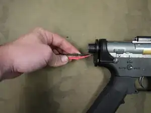 Возможно, потребуется переключать селектор туда-обратно между предохранителем и полуавтоматом, чтобы редуктор вышел. Редуктор должен немного сдвинуться вперёд, а затем подняться и выйти из приёмника.