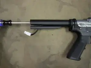 После выкручивания винта сдвиньте буферную трубку так, чтобы обнажить разъёмы проводки между трубкой и корпусом оружия.